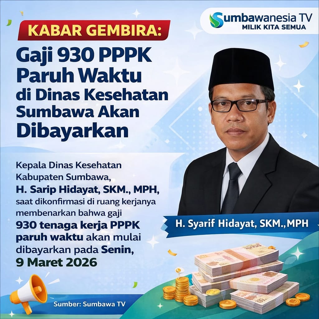 Sumbawa, Sumbawanesia.comJum’at 6 Maret 2026.luar Biasa, Langsung Direspon oleh Kepala Dinas Kesehatan Sumbawa..!! Gaji 930 PPPK Paruh Waktu di Dinas Kesehatan Sumbawa Akan Dibayarkan. Kabar baik datang bagi ratusan tenaga kesehatan PPPK paruh ...